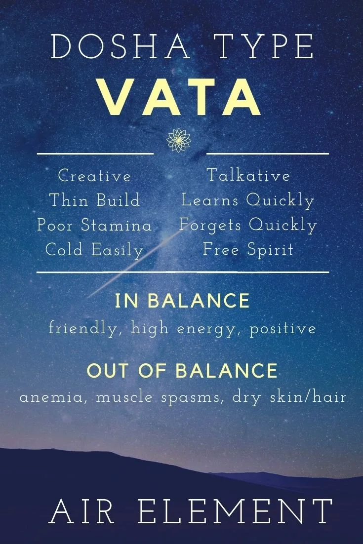 Vata is governed by air + ether — light, dry, mobile, and changeable.